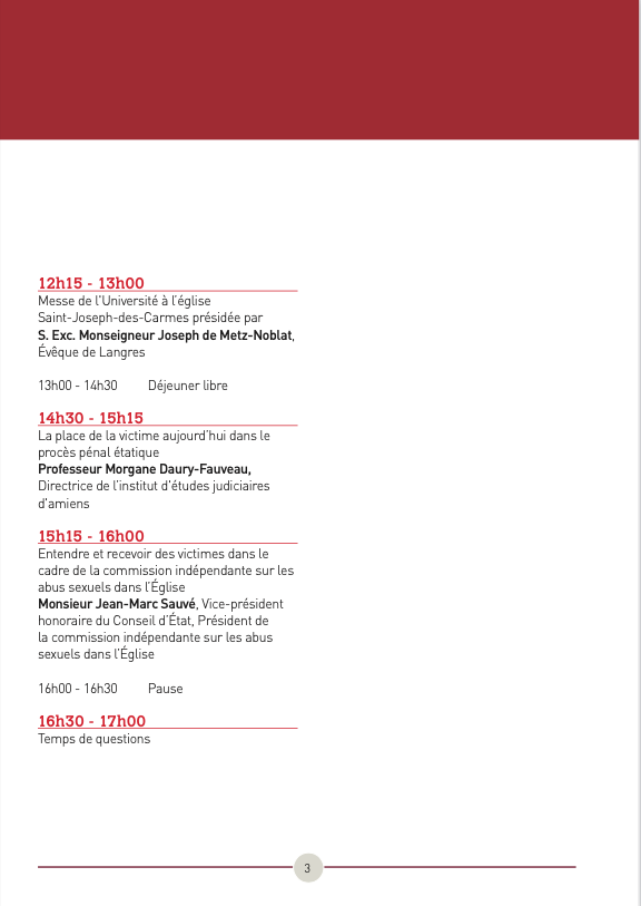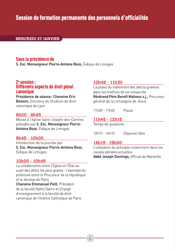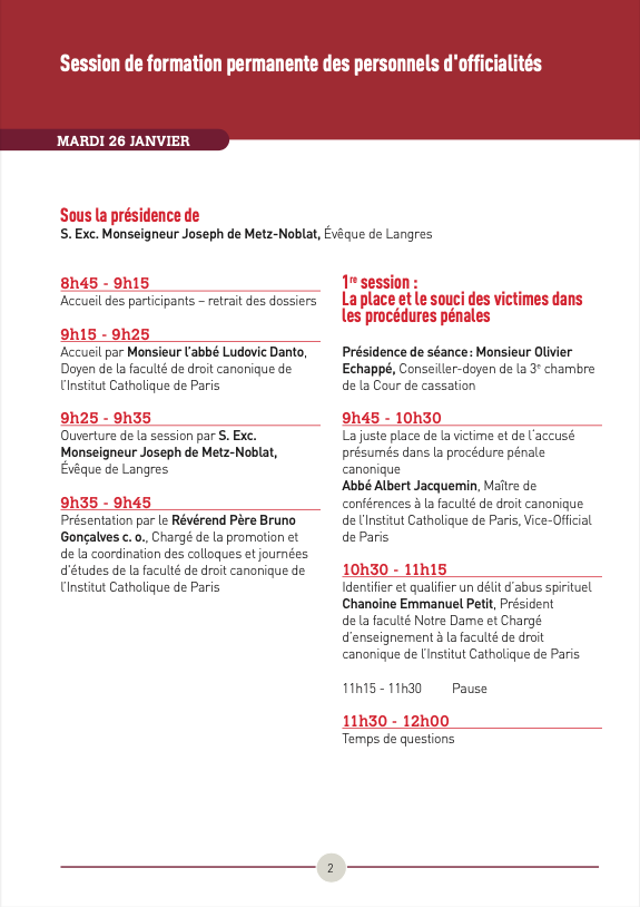 La première session, présidée par Monseigneur Pierre-Antoine Bozo, évêque de Limoges, s’intéresse non seulement à la place des victimes dans nos procédures mais veut encore plus largement évoquer le souci pastoral de nos institutions à leur endroit. Pour se faire, nous essayerons de qualifier les délits d’abus spirituel ou encore de recevoir la réflexion de différentes instances sur le sujet.