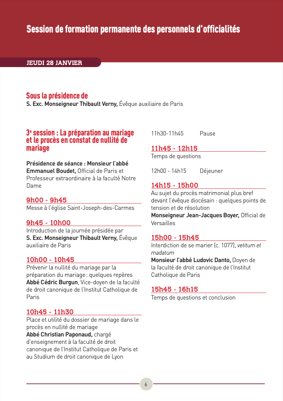 Avec la troisième session, présidée par S. Exc. Monseigneur Thibault Verny, évêque auxiliaire de Paris, sera notamment évoquée la question du lien entre la préparation au mariage et son incidence dans la procédure en constat de nullité de mariage.
