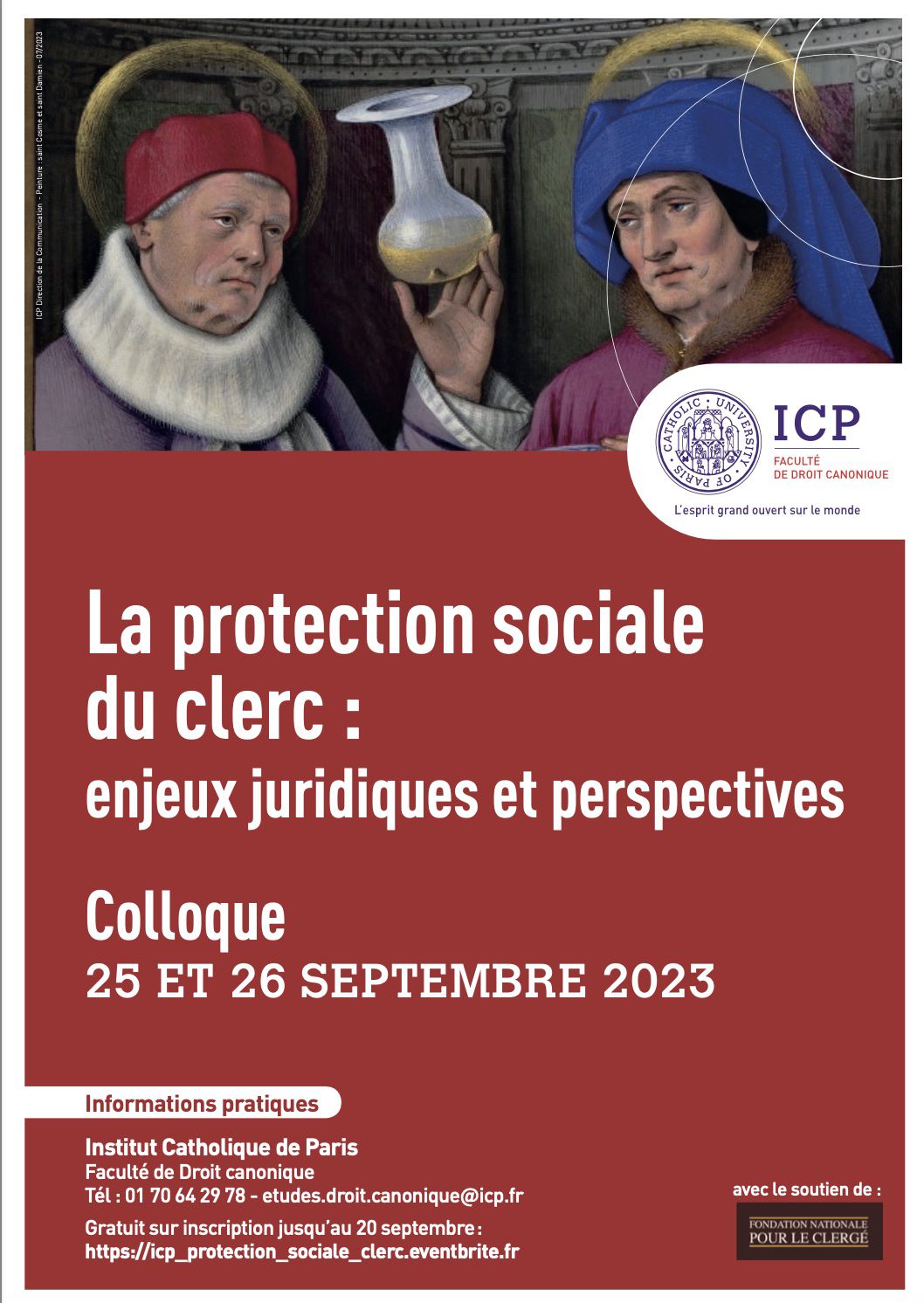 Ce colloque de deux jours se proposera d'étudier la protection sociale du clerc dans le contexte français. Soutenu par la Fondation Nationale du Clergé, ce colloque est entièrement gratuit ; néanmoins, les inscriptions sont obligatoires.