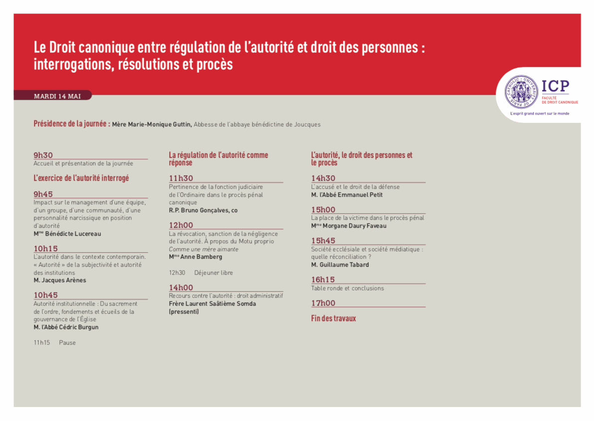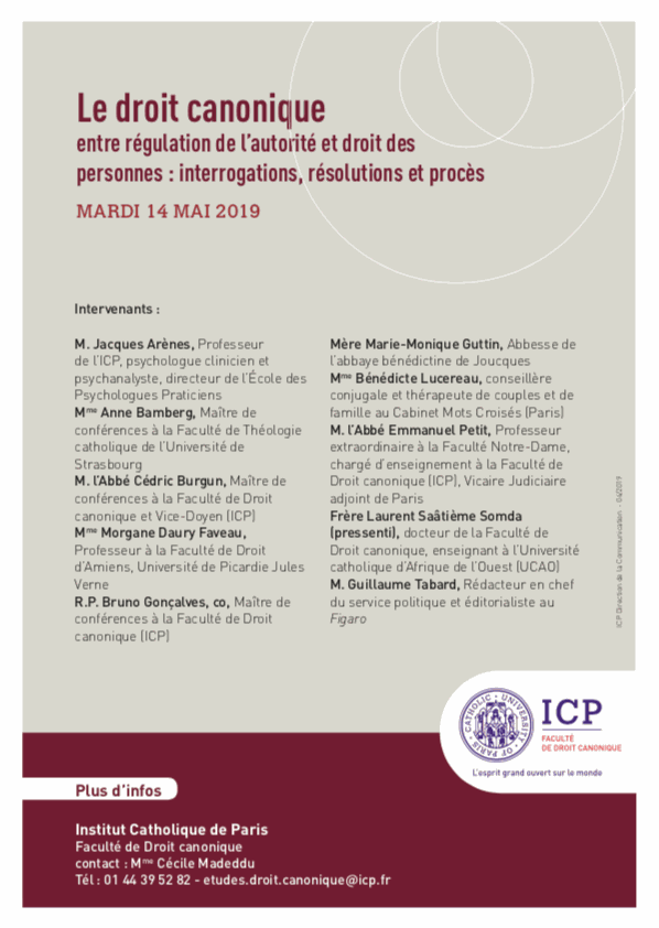 Le 14 mai prochain, la Faculté de Droit canonique de l'Institut Catholique de Paris organise une journée d'études sur le sujet "Le Droit canonique entre régulation de l'autorité et droit des personnes : interrogations , résolutions et procès". Sous la présidence de Marie-Monique Guttin, Abbesse de l'Abbaye bénédictine de Jouques, la journée se propose d'interroger le gouvernement ecclésial avec en perspective la protection des personnes.