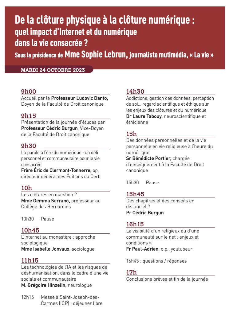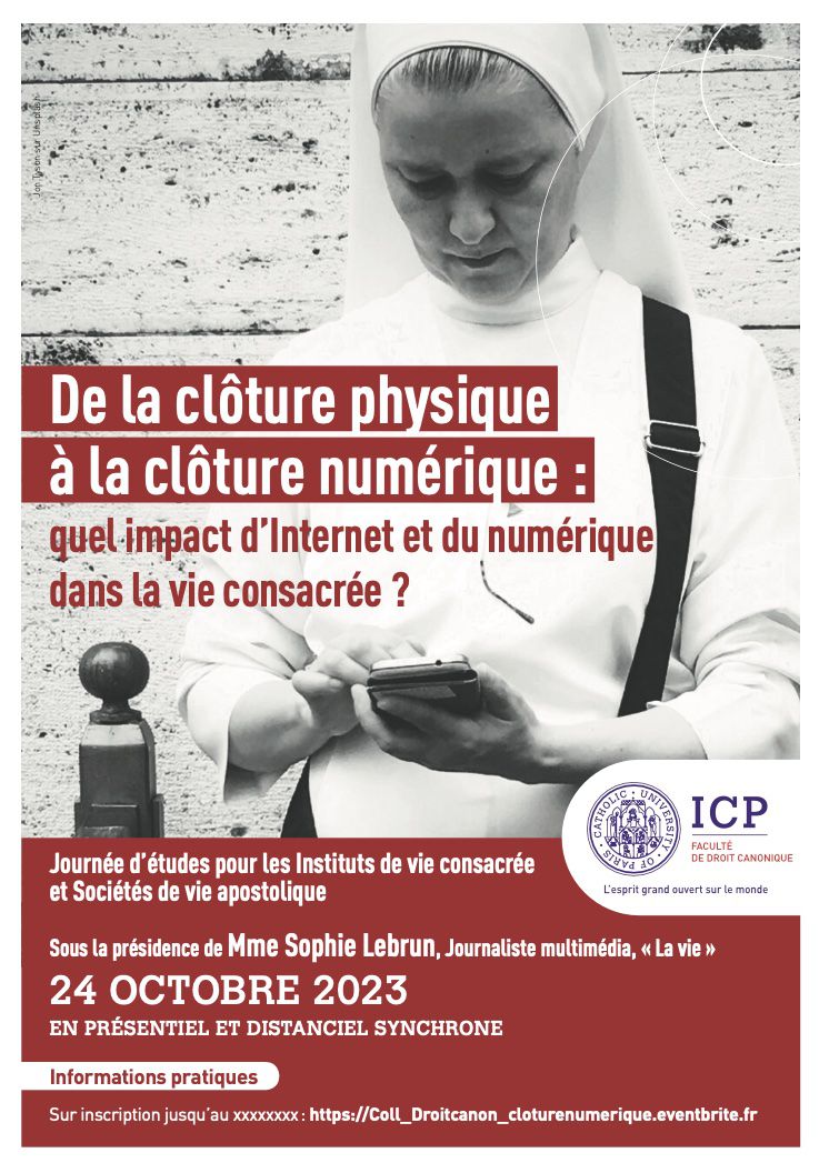 Comment les Instituts de vie consacrée et Sociétés de vie apostolique font-ils face à cette vague numérique ? Quel impact pour la vie communautaire et le rapport au monde ? Cette nouvelle journée d'études, organisée par la Faculté de droit canonique, sous l'égide du père Cédric Burgun, voudrait poser cette question de fond : de la clôture physique à la clôture numérique, quel impact pour la vie consacrée ?