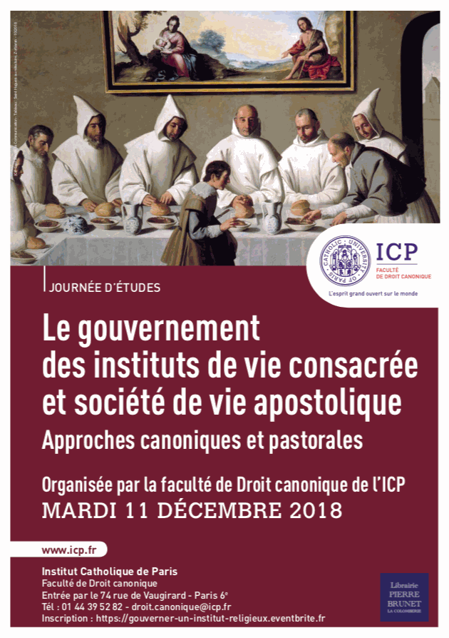 La Faculté de Droit canonique organise le mardi 11 décembre prochain une journée d'études sur le gouvernement des Instituts de vie consacrée et des sociétés de vie apostolique, dans une approche canonique et pastorale.