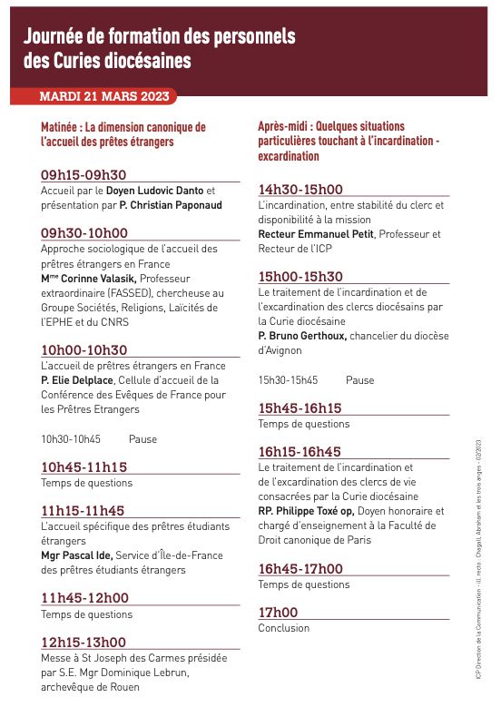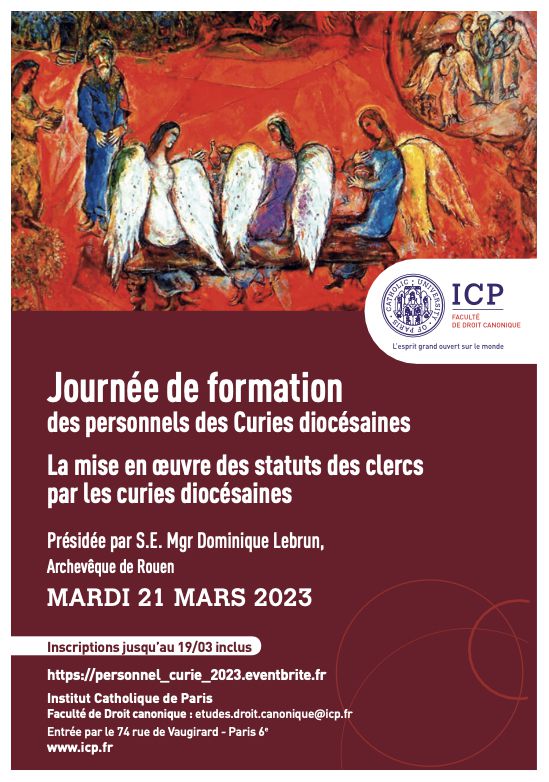 Comme tous les ans, la Faculté de droit canonique organise sa traditionnelle journée de formation des personnels de curies diocésaines le mardi 21 mars 2023, sur le thème "la mise en oeuvre des statuts des clercs par les curies diocésaines".