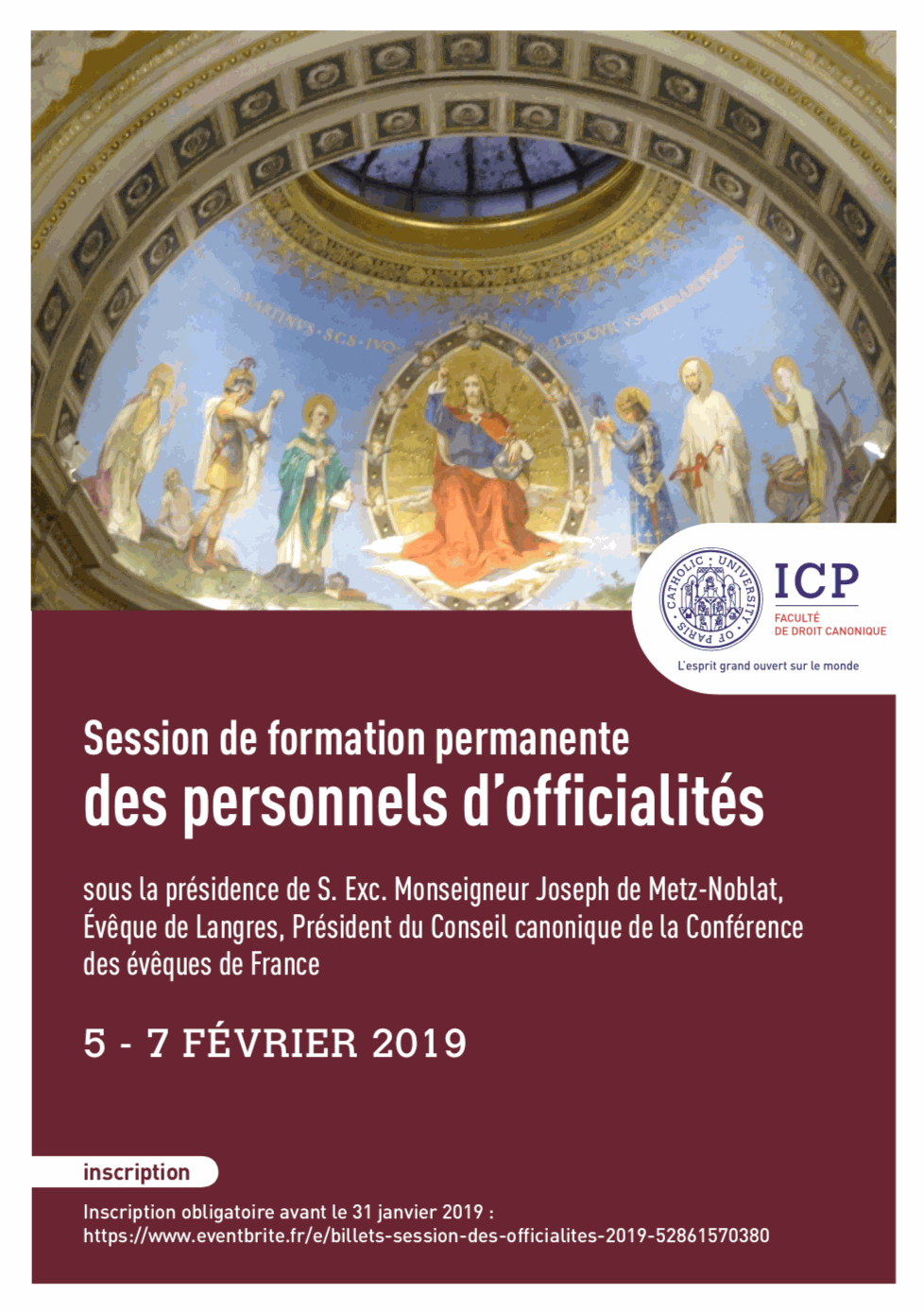 Nous sommes heureux de vous annoncer la session de formation permanente des personnels d’officialités sous la présidence de S. Exc. Monseigneur Joseph de Metz-Noblat, Évêque de Langres, Président du Conseil canonique de la Conférence des évêques de France (5 - 7 février 2019).